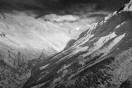 Beautiful mountains aerial landscape view. Mountain peak of rocks covered by clouds and fog. Mountain chain. Highest mountains in world. High resolution photo