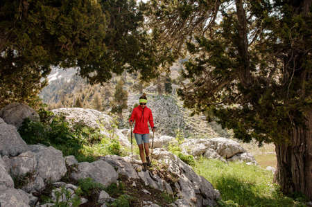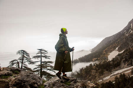 Girl in the raincoat walking on the rocks with backpack and sticks