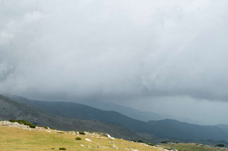 The peaks in mountain Pirin on background of dramatic sky storm clouds in summer