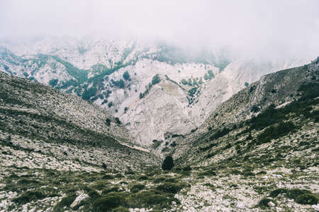 View on mountain with low hanging clouds and green trees. South Crete neat Rethymno, Greece
