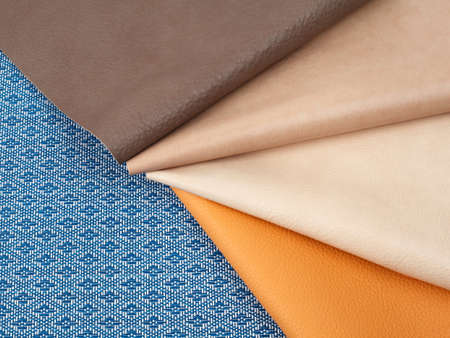 Sample of leather textile brown and gray colors, background. Catalog and palette tone of Interior fabric for furniture, closeup. Collection of multicolored cloth with skin pattern, macro.
