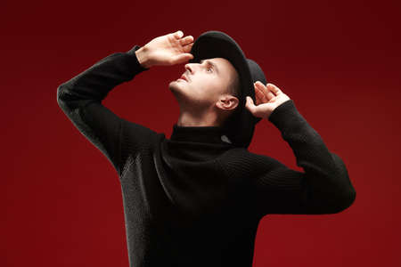 Men's fashion and beauty. Expressive handsome young man in stylish black turtleneck and a hat poses with his arms up. Sideview studio shot on a red background.