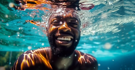 Dark skinned African man swimming under water in the pool, blue ocean water in the summer Holiday. Black handsome man happy portrait. Active,sports,vacation concept funny