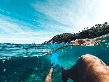 Perhentian Island , Malaysia - August 15th, 2018 :Top view of sea diver in a water suit is swimming with fish