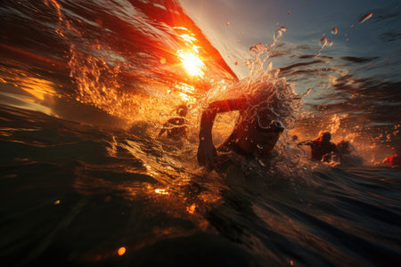 Close-up of surfer catching a wave under golden sunset, capturing movement, thrill, and the spirit of ocean adventure.