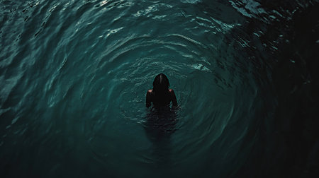 A solitary figure floats in dark, turbulent water, creating a sense of isolation and introspection.