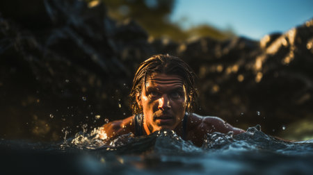 a man raises his hands in the air as water splashes over him, creating a snow-like effect. this captivating social media portrait captures the essence of ocean academia. the photo, taken with fujifilm superia, showcases the strong facial expression of the subject, portrayed by even mehl amundsen. tooth wu. ai generated