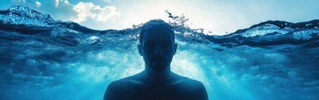 A person standing beneath the surface of the ocean, surrounded by deep blue waters, A menacing silhouette lurking in deep blue waters
