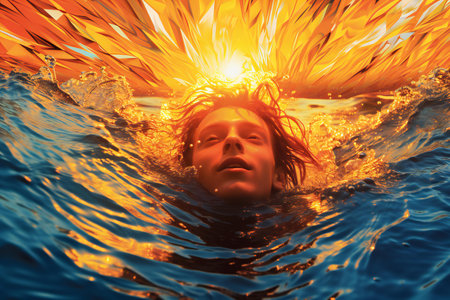 In a tranquil underwater setting, a man appears serene as sunlight dances on the water's surface, creating a beautiful glow that highlights his presence.