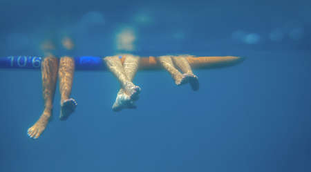 An image captures a hand reaching up towards the surface of water, illuminated by strong sunlight. The composition features a blue and turquoise color palette, highlighting the underwater environment. The image likely symbolizes connection and may be suitable for various commercial or editorial applications.