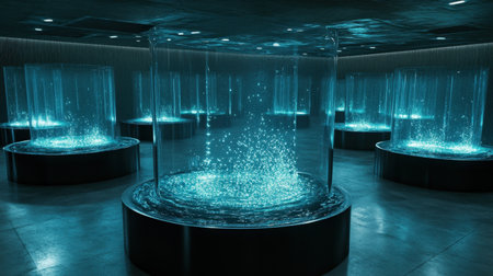 This captivating image features a futuristic lab with glowing water columns and bubbles in a sleek modern design, creating an ethereal atmosphere.