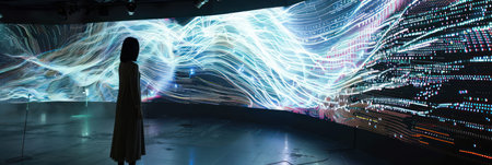 Visitor standing in dark room contemplating immersive digital art projected on multiple screens, creating a mesmerizing visual experience. Ai generated image