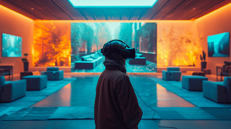 A person stands in a contemporary lounge, engaged with a virtual reality headset, surrounded by warm ambient lighting.
