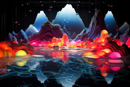 Participants engage in a captivating virtual reality experience within a vibrant and colorful light-filled space, showcasing technology's artistic potential.