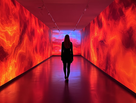 A woman in a dark dress stands in a long corridor. Walls are covered with large, vibrant red and orange digital displays depicting flame-like patterns. The floor reflects the intense light.