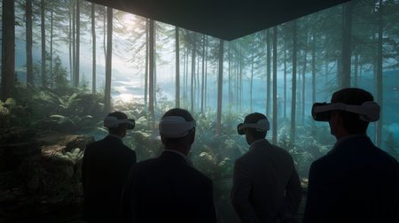 People experiencing immersive virtual reality in digital world