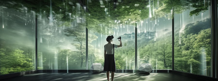 virtual reality is coming to an office setting, in the style of green energy and carbon credit,forest office