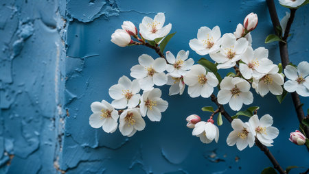 Delicate white flowers blooming on a branch against a textured blue wall, creating a serene and beautiful contrast. Ai generated image