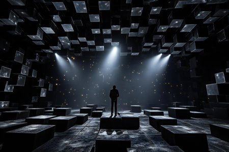 Silhouette of a man standing in front of a wall of cubes with lights