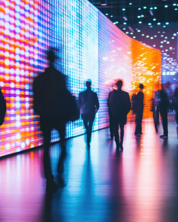 Attendees navigate a vibrant convention center filled with eye-catching booth designs and luminous bokeh lighting, creating an engaging atmosphere for networking and exploration.