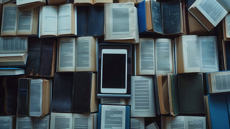 Tablets and e-readers showcasing educational materials and e-textbooks, nestled within a sea of traditional books.