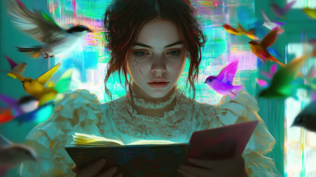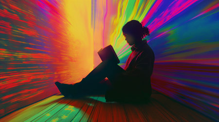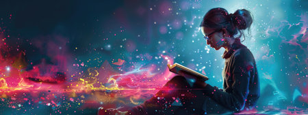Teen Girl Reading Book with Futuristic Elements and Bright Vibrant Colors in Digital Art