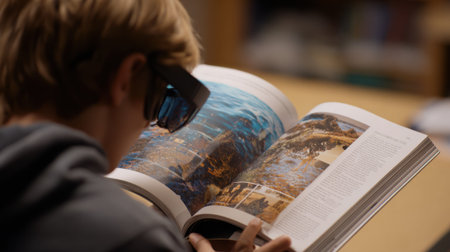 Medium shot capturing a student exploring educational content through an augmented reality print merging textbook pages with immersive digital learning experiences.