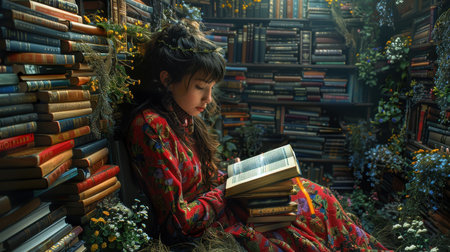 A girl in the Library with a large selection of books. A girl is reading a book in her home library.
