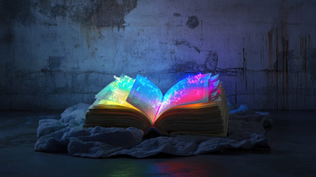 A stunning open book radiates colorful light effects against a rustic backdrop, creating a dreamlike atmosphere perfect for capturing imagination and creativity.