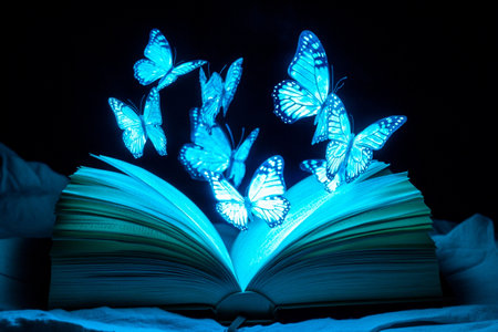 An open book radiates light in a dimly lit space, as glowing butterflies gracefully emerge, illuminating the surroundings with their vibrant colors and enchantment