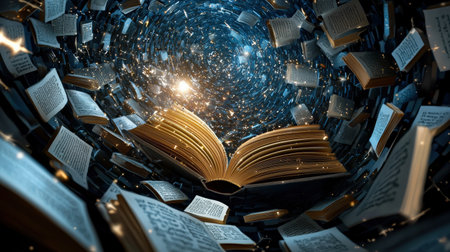 A creative representation of knowledge as a galaxy of glowing books and letters swirling in space