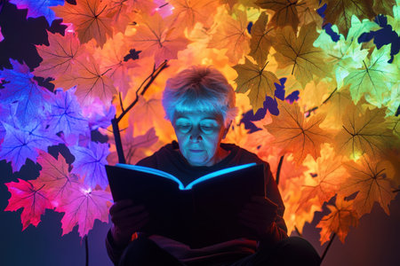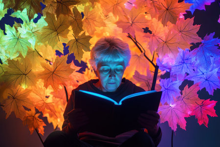 An elderly individual enjoys reading a book amid colorful glowing leaves at night, creating a magical atmosphere.