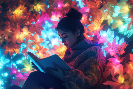 A young woman sits quietly, engrossed in her book, amidst vibrant autumn leaves illuminated by soft lights.