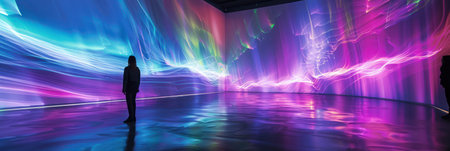 A lone figure stands silhouetted in a futuristic command center, bathed in the cool blue glow of massive video walls. This immersive environment represents the cutting edge of data visualization, media consumption, and the dawn of the metaverse, symbolizing innovation and the endless flow of digital information.