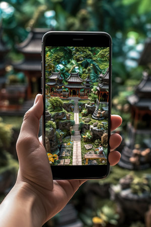 A person taking a picture of a japanese garden. Generative AI.