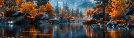 the serene landscape, bathed in the warm hues of autumn, exudes tranquility as a veil of fog gently wraps around the majestic trees, creating a mystical atmosphere, perfect for relaxation and contemplation, showcasing the beauty of nature in stunning 8k resolution. ai generated