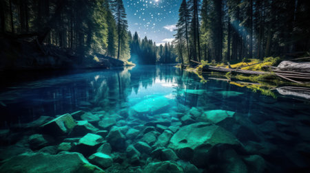 Beautiful lake in the forest at night with stars in the sky