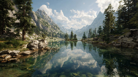 the serenity of a mountain lake glistening. the pristine natural beauty of a secluded mountain oasis. the perfect blend of nature's tranquility and vibrant colors in this stunning landscape
