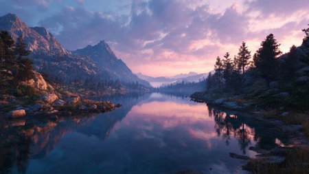 A serene mountain lake at dawn background with calm waters, rising mist, and the textures of rugged peaks and tranquil reflections, creating a peaceful and majestic natural scene.