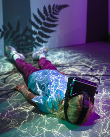 Child girl with virtual reality glasses laying on the VR room floor, lit by fluorescent light effects treetop grow simulation. Science and children concepts.