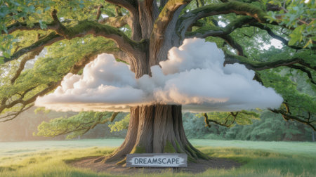 A massive ancient oak tree with moss-covered branches stands in a sunlit meadow. White clouds float around the trunk, and a sign reads DREAMSCAPE.