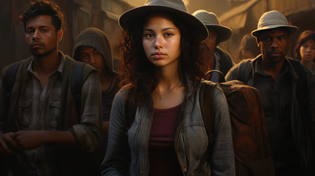 Large groups of people with backpacks and suitcases gather at a crowded border, facing challenges and searching for hope and safety.