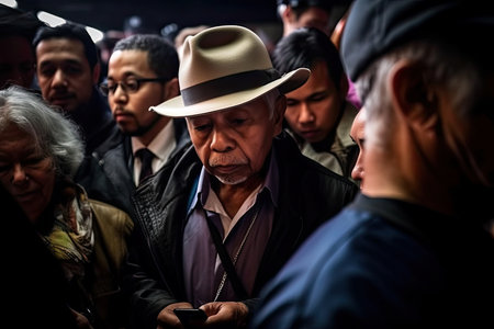 an old man wearing a hat and looking at his cell phone while standing in the middle of a group of people. Generative AI