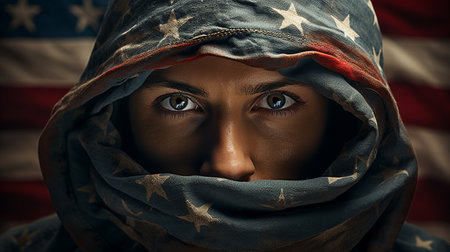A young man gazes directly at the viewer with a serious expression. He stands in front of an American flag, highlighting themes of patriotism and identity in a vibrant setting.