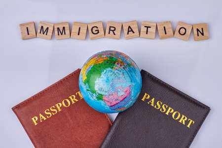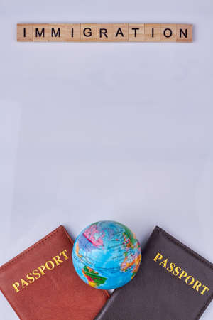 Passports, globe and wooden cubes with text immigration close up. Flat lay style.