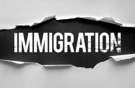 Distressed white word Immigration revealed beneath torn white paper on a dark background. Conceptual image symbolizing migration, policy, border, and social or legal movement topics