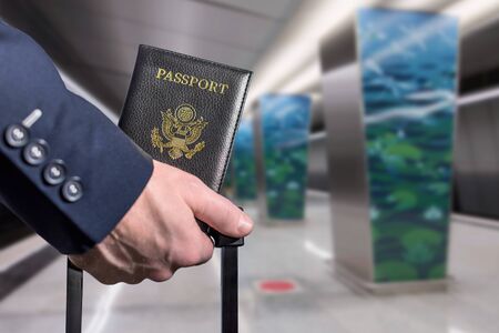 Man (businessman) in a blue suit with suitcase holding american passport with at the airport train