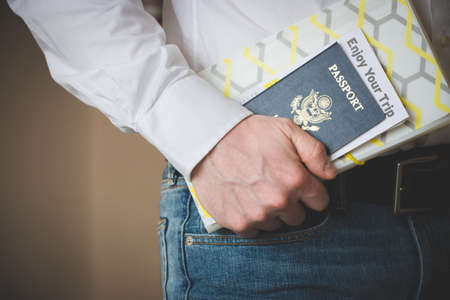 American passport in the hand of a young man. Passport and travel documents. Waiting for a flight at the airport at customs or passport control. Business trip. Open world.