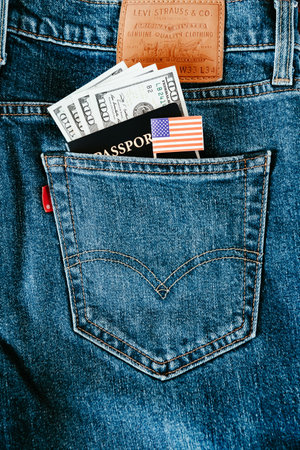 American passport and US dollars in the pocket of American Levi's jeans. Symbols of the American way of life.