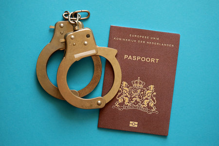 Netherlands passport with police handcuffs on table close up.